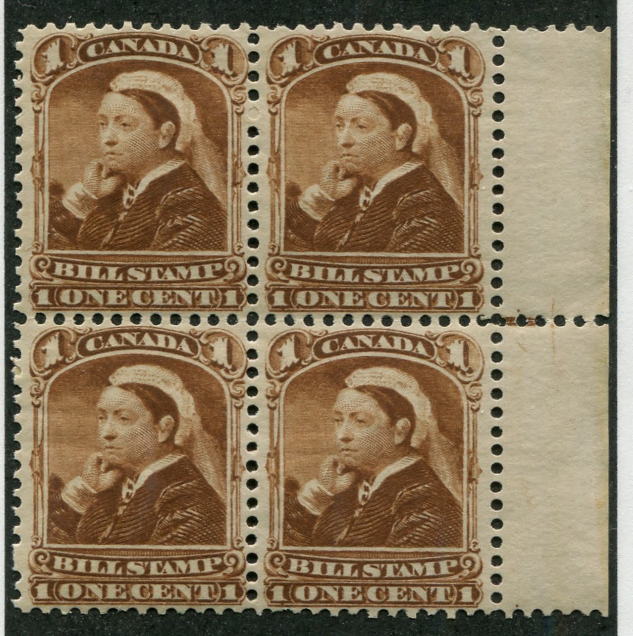This is the federal Bill Issue for 1868. Bill stamps were attached to negotiable instruments like promissory notes, cheques and bank drafts. All cheques until fairly recently (sometime in the 1950's) used to have an excise tax payable for processing them. The above 1c stamps would have been affixed to every single cheque cashed by the banks at that time. Thus, while not rare in used condition, pristine blocks like the one shown above are not common.