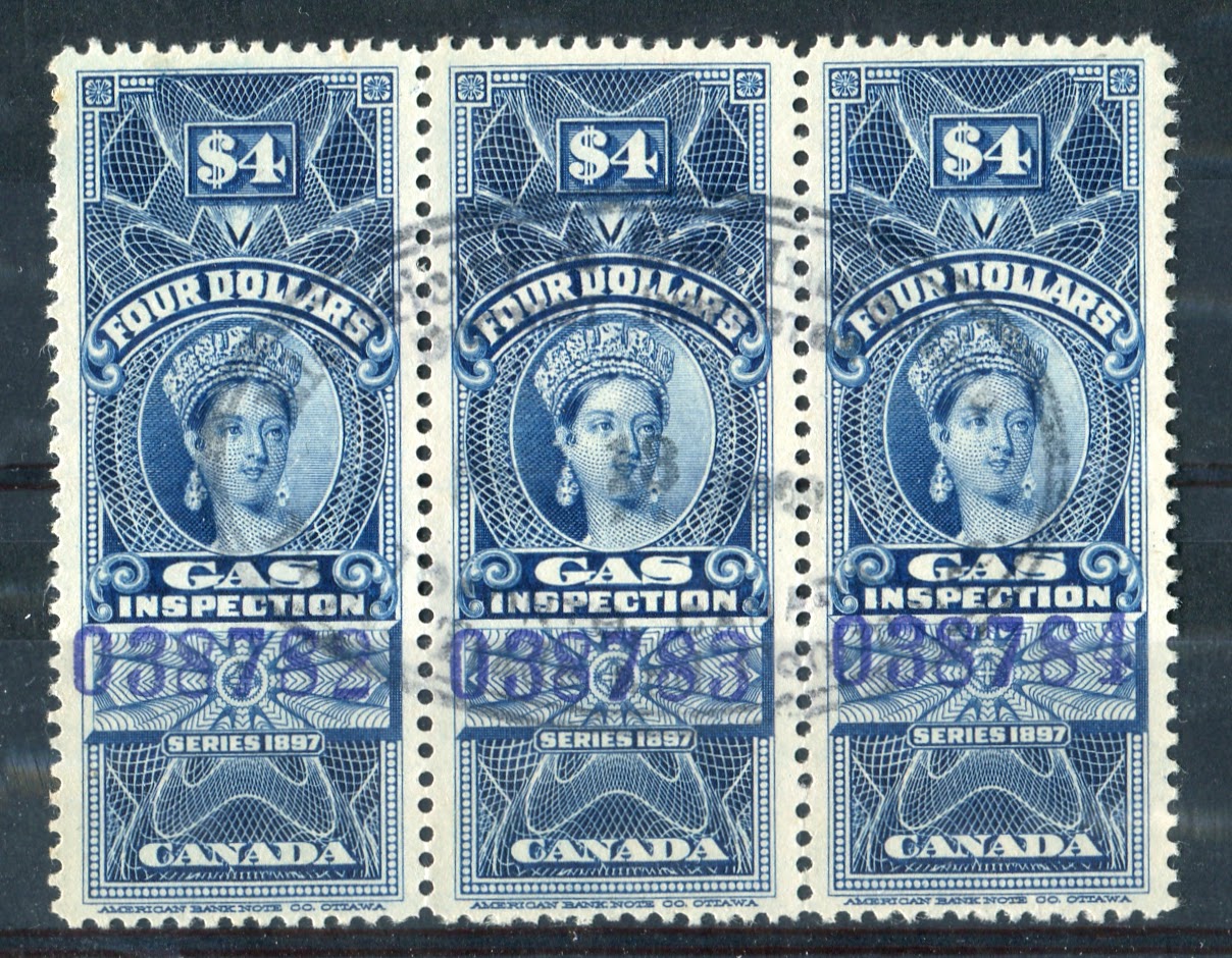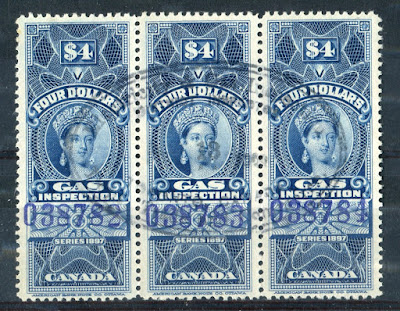 Next we have gas inspection stamps. All gas connections had to be inspected for safety compliance and the payment of the inspection fee would be evidenced by attaching gas inspection stamps to the inspection document. The above strip is used and is from the 1897 series, which was in use until 1930.