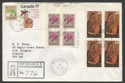 On this cover, the only definitive present is the 10c Lady's Slipper stamp and a plate block of the 5c Shooting Star from the floral issue. The remaining $1.37 has been paid entirely with commemoratives, including a plate block of the high value 1978 Christmas Issue and the 17c postal code issue. Given the size of the stamps, it is a difficult franking to improve upon. What makes it even better though is that there are two plate blocks. You almost never see plate blocks on anything other than official First Day Covers. Most people would have torn the selvage off in order to make sure that the stamps would fit on the envelope. The 1978 Christmas issue was released on October 20, 1978, so while May 1979 is a bit late, it is still not out of period.