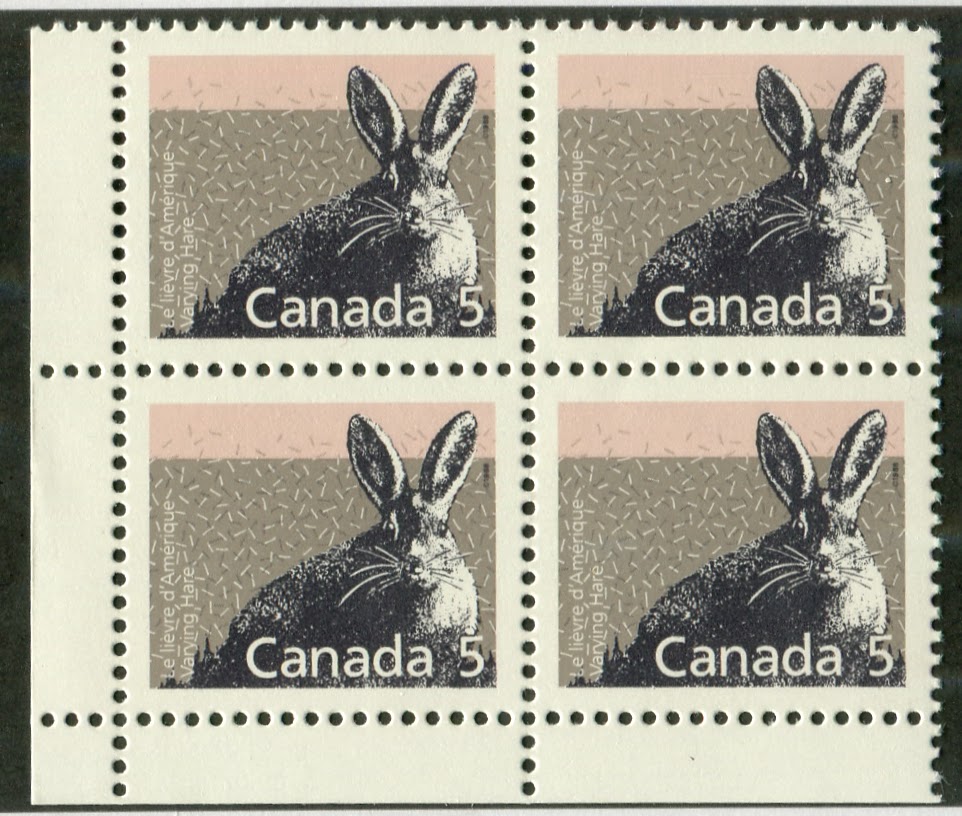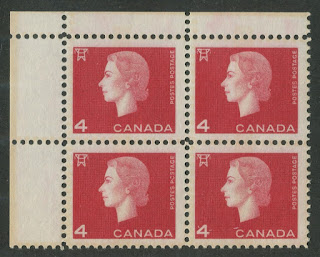 This series has very few fluorescent varieties, but lots of perforation changes and different papers - Slater, Rolland, Harrison, Peterborough and Coated Papers. Some of these like the 74c Wapiti on Rolland paper are rarities worth several hundreds of dollars. Most of the better varieties are found only on the field stock printings, so there are no plate blocks - only blank blocks like the one shown above.