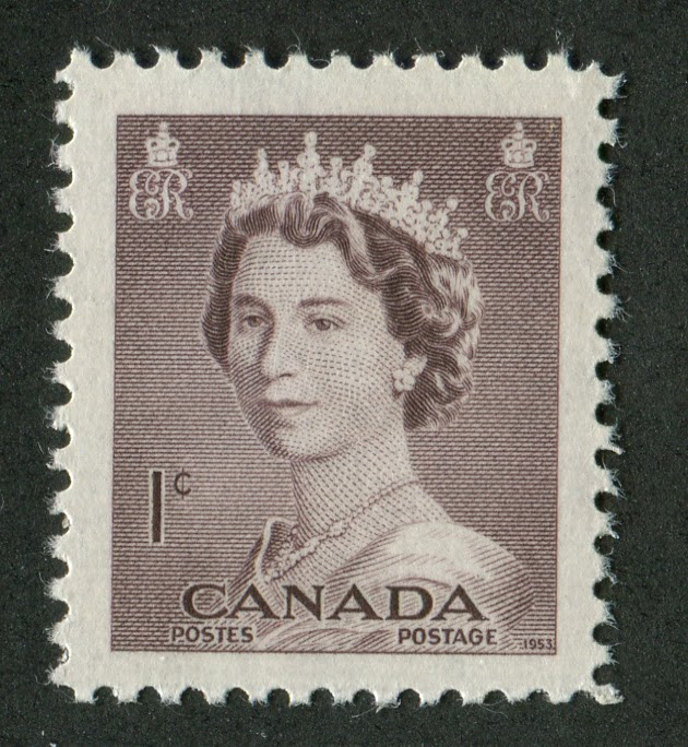 The first issue of the present reign is nicknamed the "Karsh"issue, after the famous photographer Yousuf Karsh, who took the above portrait of the young Queen. This series consisted of 1c, 2c, 3c, 4c and 5c stamps of the above design, as well as a 7c, Canada Goose, a 20c Pulp and Paper Industry design, a 50c Textile Industry design and a $1 totem pole design. The 1c-5c values were replaced in 1954 by the stamps of the next series, but the 20c remained in use until 1956, the 7c and $1 until 1963 and finally the 50c until 1967.