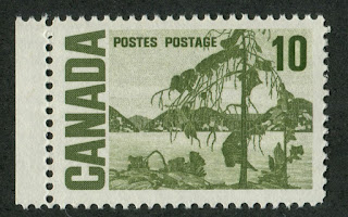 This issue is one of the most popular among collectors due to its complexity. It is called the Centennial Issue due to the fact that it was first issued in Canada's Centennial year, on February 8, 1967. The set consisted of 1c, 2c, 3c, 4c, 5c, 6c, 7c and 8c values depicting the Queen on the right and a different scene from Canada on the left. There were also a series of designs reproducing famous paintings by the Group of Seven. These were the 8c, 10c, 15c, 20c, 25c, 50c and $1 values. The 10c above is the famous "Jack Pine" by Tom Thompson. The higher values were replaced in late 1972 by the stamps of the next series and the low values in 1973.