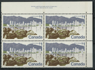 This series is nicknamed the "Caricature and Landscape" issue due to the fact that the low values consisted of sketches of former Prime Ministers and the Queen, while the high values depicted various Canadian landscapes. The low values consisted of a 1c John A Macdonald, 2c Laurier, 3c Borden, 4c Mackenzie King, 5c Bennett, 6c Pearson, 7c St. Laurent, and 8c & 10c Queen. The higher values comprised a 10c Forrest, 15c Mountain sheep, 20c Prairies,25c Polar bears, 50c Seashore, $1 Vancouver as shown above and $2 Quebec City. The low values were replaced in 1977 by the next issue and the higher values were replaced between 1977 and 1979. This was the issue that sparked my interest in stamps.