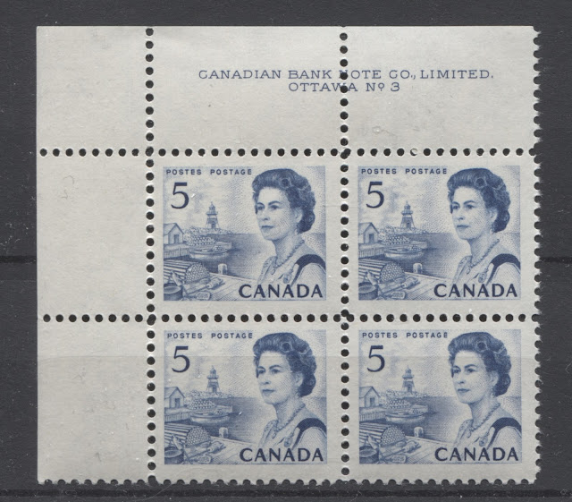 It consists of a shadow of a double "C" for the "C" in "Canada", that is placed just to the right of the main letter on the inside. Unitrade notes it's position on the sheet as position 10, but makes no note of whether it comes from plate 1 or plate 2. It is listed as having come only from the perf. 10 printings, which means that it must have originated from one of these two plates. Curiously enough, Unitrade does not list a plate block for this variety, which is odd, because every upper right corner block from the upper right pane should have this variety, if it is indeed from position 10.