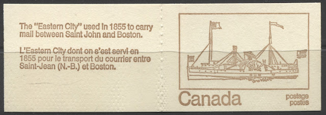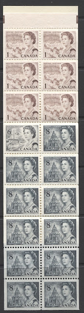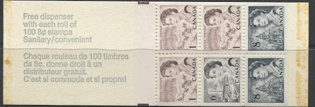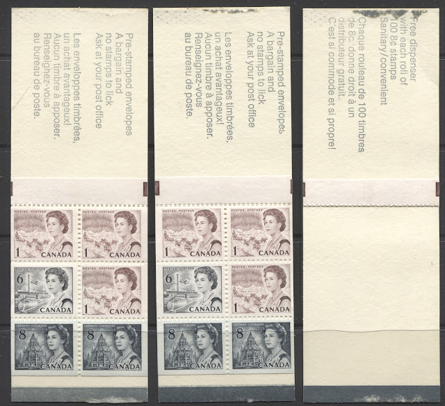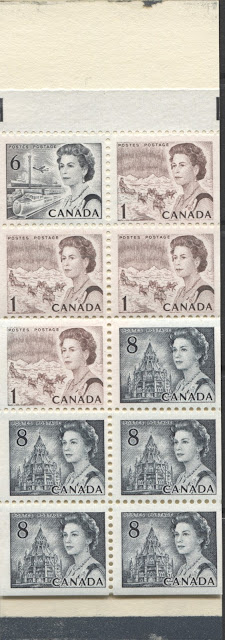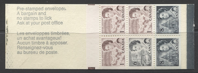 Today's post will be the first of the New Year, and will deal with the last three integral booklets that were printed by the British American Bank Note Company, for this issue, being the 25c, 50c and $1 booklets that contained the 8c slate Parliamentary Library together with various quantities of the 6c transportation and 1c Northern Lights and Dog team. This combination of stamps allowed the user to make up the 8c domestic rate, the 6c third class rate, the 10c U.S rate, and 15c airmail rate. These later two rates would have been the main use for the 1c stamps that were included in each booklet. The experiment conducted in Toronto with the 50c booklets was a clear success, and so it was decided to make 50c booklets a permanent addition to Canada Post's repertoire.