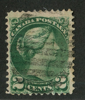 This stamp is #36, the 2c Small Queen. It is just as common as the 3c stamp above. It catalogues $1 in fine condition and $3 for very fine in the Canadian Unitrade catalogue.