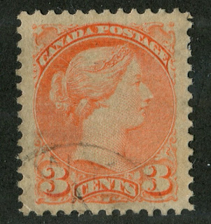 This stamp is Canada #41 and is probably one of the most common stamps of its time. It catalogues $1 for very fine used and $0.30 for fine in the Canadian Unitrade Catalogue. Although is is very common in fine or below fine condition, it is not common in grades higher than very fine as shown above. If you had a collection of 1,000 #41's that looked like the stamp above, it is quite likely that you may receive more than $1,000 at auction. A dealer won't offer you more than $500-$600 as in the example above, but you may net more than full catalogue at auction. Why? Two reasons. First is the scarcity of the condition. Even though the catalogue's top graded price is $1, that is not the true value of a stamp in the Extremely Fine or Superb grades. Such stamps may retail for as much as $5-$10 each because of their scarcity. The second reason is that the catalogue value does not take the scarcity of specialized paper varieties, plate flaws, rare shades and cancellations into account, and a collection of 1,000 examples would probably have some of these.