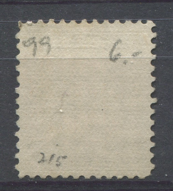 Here is the back of a 5c blackish purple on the so called thin paper. You can clearly see very large dark spots on the paper, which are the gaps in the very coarse mesh. The gum is smooth and yellowish. Unfortunately, used stamps on this paper are quite scarce, so I do not currently have one I can illustrate.