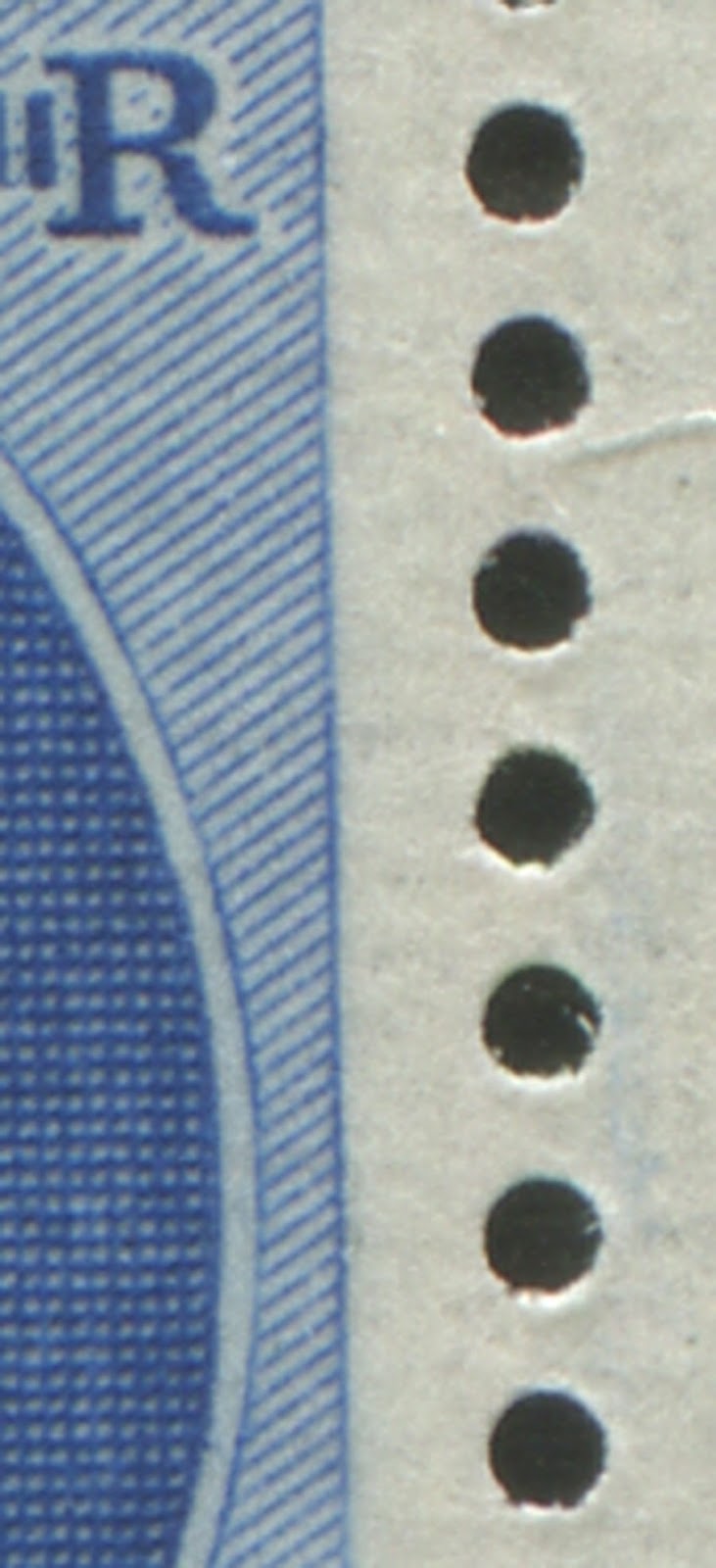 This semi-circular arc flaw has been found on the 2c green. I do not know if it is constant, or is found on any other values. I think it likely is a freak flaw.