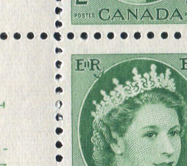 This variety is really more of a deformity of the "E"in the left "EIIR"of some of the 2c, 4c and 5c coil stamps. It is a constant variety that can be found in complete rolls of the coil stamps. So in a sense it is the most common of all the varieties in this post. I do not know what the cause is, but it is likely some aspect of the coil production and the same thing that was responsible for the weak corner variety on the 2c Postes-postage coils and the narrow "1" and damaged "2" varieties on the 1935 Pictorial issue coils.