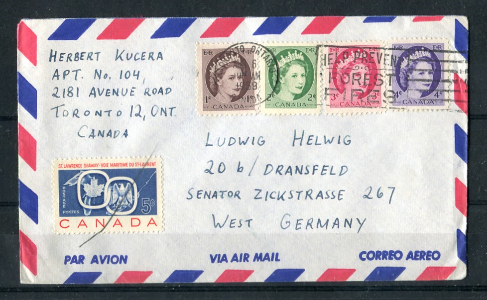 15c airmail cover to Germany with 1c-4c plus 1959 St Lawrence Seaway commemorative paying the first class airmail rate.