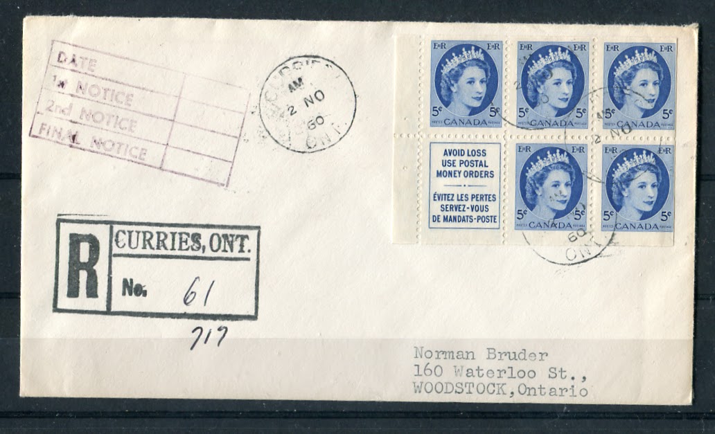 25c domestic forwarded registered letter with a complete booklet pane of 5 of the 5c blue paying 5c postage, plus the 20c registration fee.