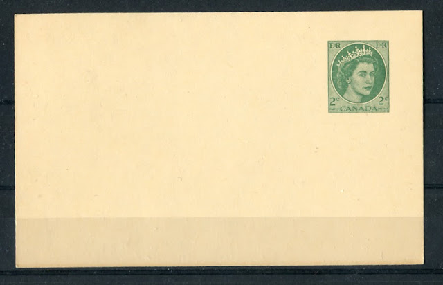 There was only one series of postal stationery issued during this period, which used the same design as the issued stamps. As with the Karsh Issue, mint postal stationery from this period is not expensive and most used stationery can be acquired for very reasonable prices. The only envelope in use that was available to the public for this issue was the #8 envelope, which was 165 mm x 99 mm. Watch for private order envelopes which were of different dimensions to these, as many of these will be quite scarce. On this issue there were two different kinds of backflap, called a knife. One was 20 mm deep and the other was 16 mm deep. The envelopes issued were all on white wove paper and were: