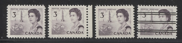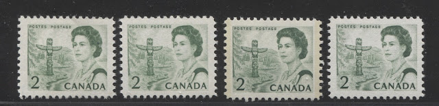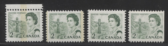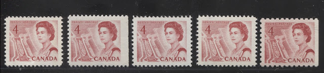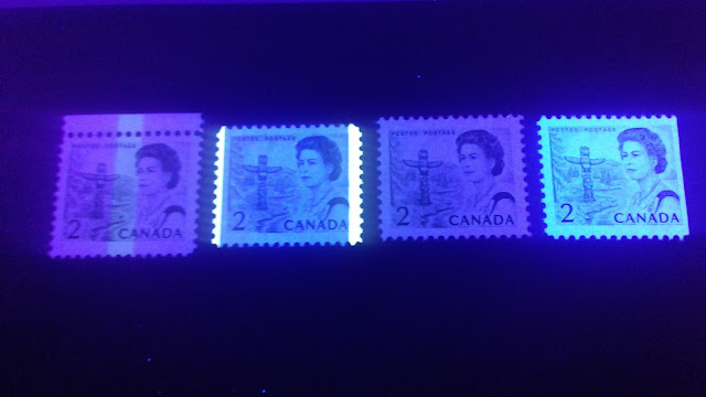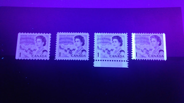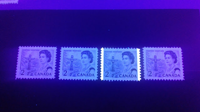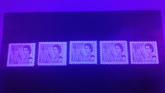 Both stamps on the ends appear to be printed in black when viewed under UV, losing all the brown. The middle two stamps both appear dark brown, with no reddish undertone, when under normal lighting conditions, both stamps have a clear reddish tone. Generally, these inks seem to be limited on this value, to those stamps printed on hibrite paper, and the PVA gum stamps with a some hint or red to the colour, whether untagged, Winnipeg centre bar tagged, or general Ottawa OP-2 tagged.