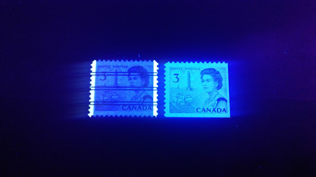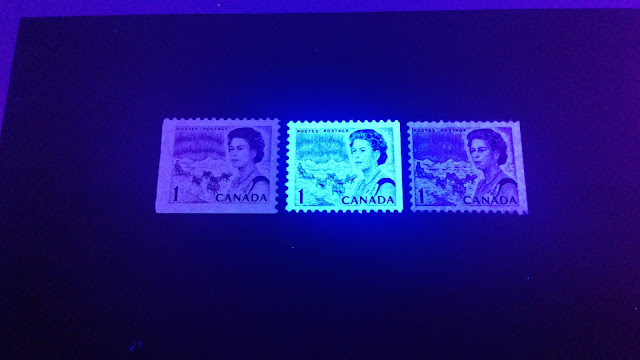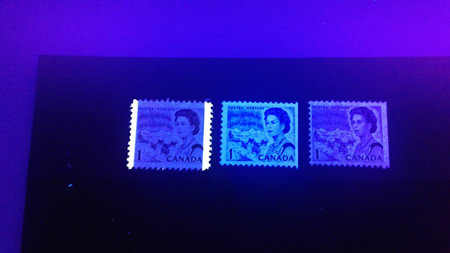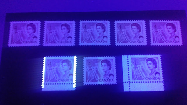 Although they do look slightly deeper here in the picture, in reality the stamps look very similar under UV to how they look in normal light. These inks appear to be limited to the CBN sheet stamps, booklet stamps and coils with dex gum, as well as the BABN booklet stamps.