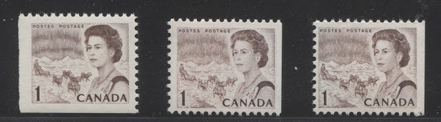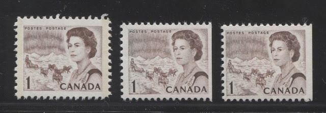 Here we have two shades of chocolate brown, on the first two stamps, and deep brown on the right. The middle and right stamps are both BABN booklet stamps, untagged and printed on high fluorescent and medium fluorescent papers, with satin PVA gum. The stamp on the left is general Ottawa OP-2 tagged and is printed on low fluorescent, vertical wove paper with matte PVA gum.