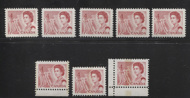 Here we have a BABN booklet stamp in the deep brown shade, with satin PVA gum, a Winnipeg tagged sheet stamp in chocolate brown, a General Ottawa Tagged stamp in reddish brown, and an untagged sheet stamp on hibrite paper in the chocolate brown shade.