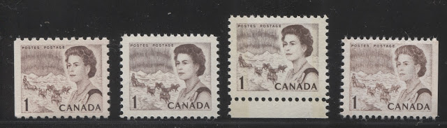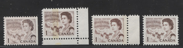 Here, starting on the left, we have the perf. 10 BABN booklet stamp in the reddish brown, shade, a deep brown CBN sheet stamp on dull fauorescent paper, a very deep violet brown sheet stamp with Winnipeg tagging, and finally another BABN booklet stamp in a dull reddish brown shade. What all of these four stamps have in common, is the somewhat dull nature of the colours.