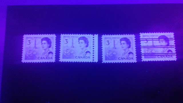 This picture is, once again, not truly representative of how these stamps actually look. However, the left stamp does appear slightly brighter here than it does under normal light. The other three stamps, do not really appear lighter, per se, but they all appear brighter, and less dull, as compared with the colours in normal light.