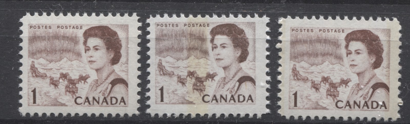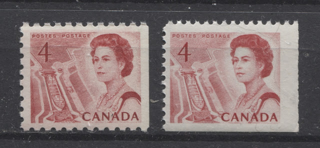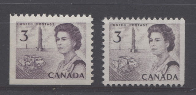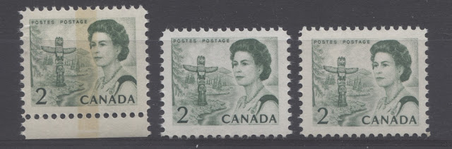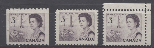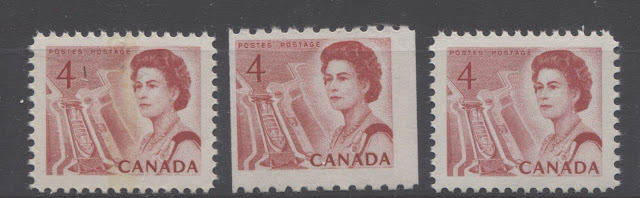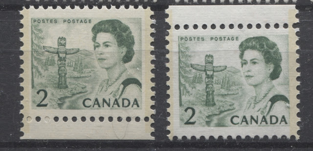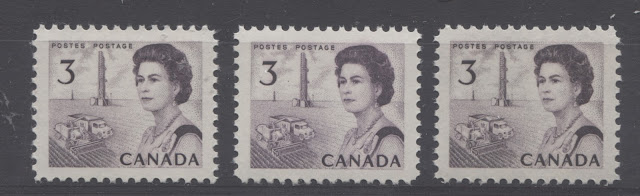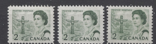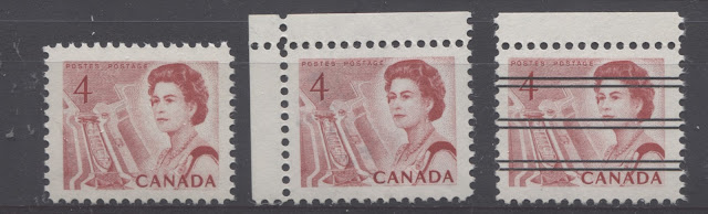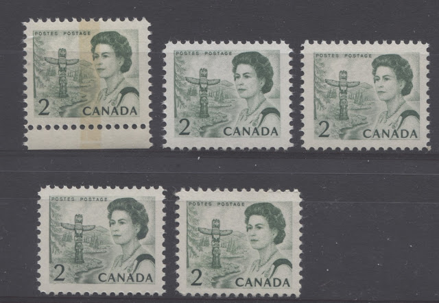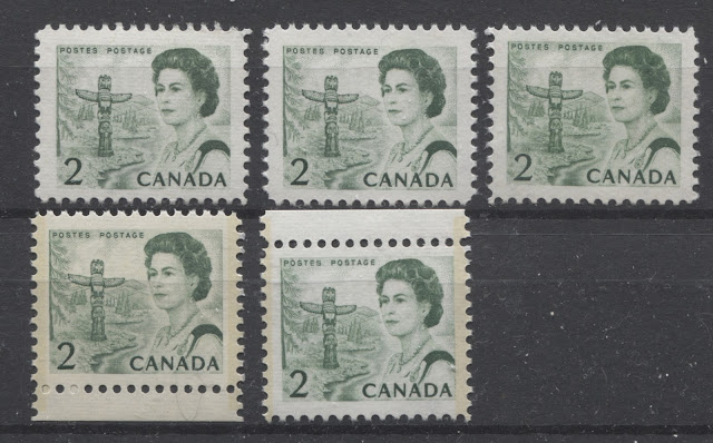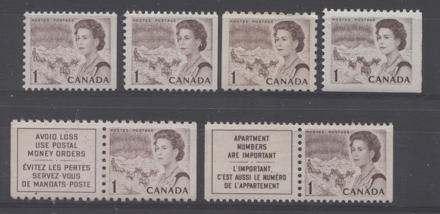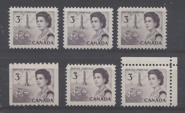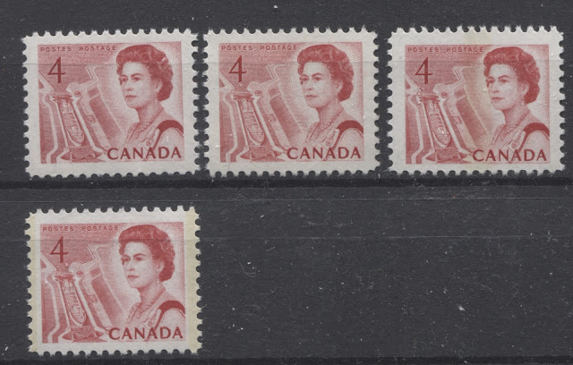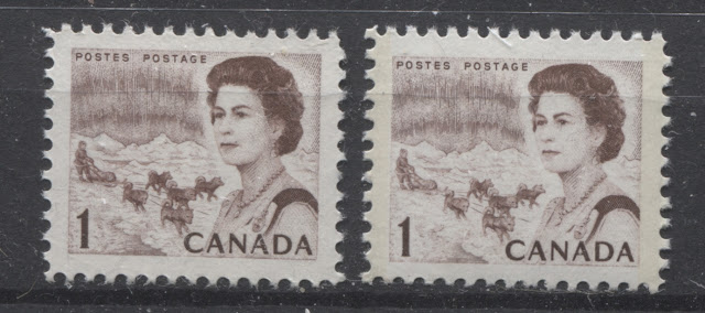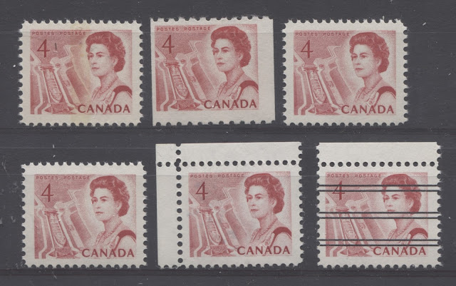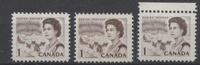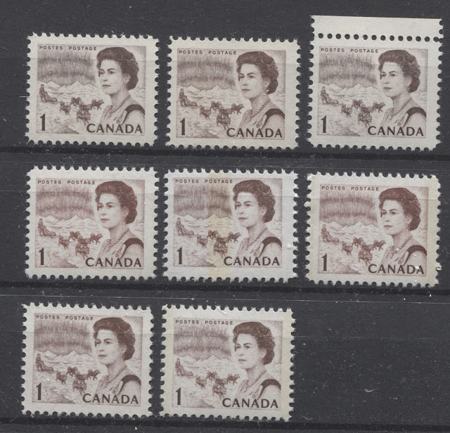 Thus, it is logical for me to tackle the issue of printing ink in eight posts: four dealing with variations between the inks in normal light, and another four to deal with variations under UV light. Today's post will look at the variations that are apparent under normal lighting conditions for the 1c, 2c, 3c and 4c. Then, over the next three weeks, I will look at the shades for the other values. Then after that, I will do the same thing, but looking at the differences under UV light. It is strange to me that no shade variations are listed in Unitrade for this issue. Although the differences between the colours of the stamps are generally subtle at first glance, once you become highly familiar with the stamps, you will begin to see that many of them look significantly different from one another. For the CBN printings. those stamps printed on paper with PVA gum tend to printed in colours which on the whole are both brighter and fresher than the earlier Dex gum printings, which are deeper and duller. The dex gum stamps on dead coated paper are the deepest of all, and it is this fact that provides some way to identify these printings, even when one does not have access to a UV lamp. The CBN booklet and cello paq stamps tend to exhibit many of the same shades found on the corresponding sheet stamps, but such is not the case with the BABN booklet stamps, which are often completely different colours from their sheet counterparts. The biggest discrepancies between booklet and sheet stamps occur on the 1c, 3c, 4c, and 5c booklet stamps, through it must be emphasized that the BABN did not print any of these stamps in sheet form, all that printing being done by the CBN. So, for those stamps, the point of comparison is between two printing firms. However, even with the 6c orange, 6c black, 7c emerald and 8c slate, there are colours on some of the sheet stamps that one does not find replicated in the booklet stamps and vice versa.