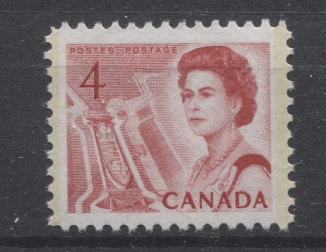 On the top row we have a printing on white vertical wove paper, with eggshell PVA. The shade here is a slightly brighter version of scarlet. The other two stamps on the top row are both on white vertical wove, with eggshell PVA, one being untagged and one being Winnipeg tagged. These two stamps are brighter, and are closest to scarlet vermilion on the Gibbons colour key. Finally on the bottom row we have an example on white vertical wove with general Ottawa OP-2 tagging. This stamp is closest to a deeper version of Gibbons's rosine shade.