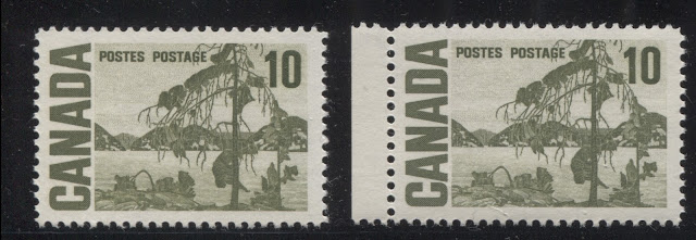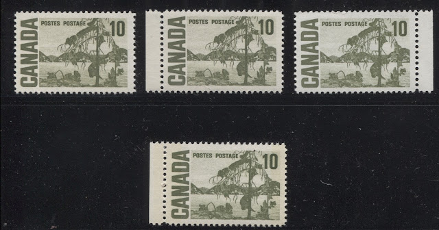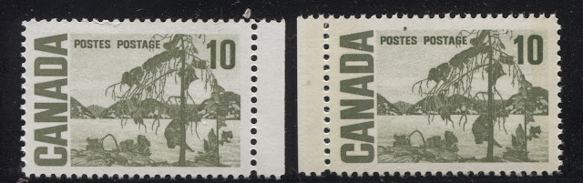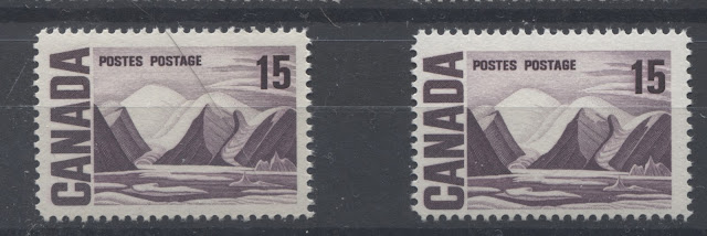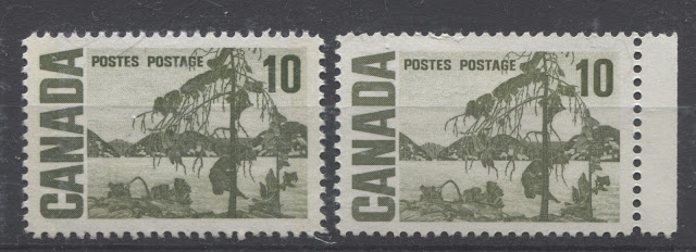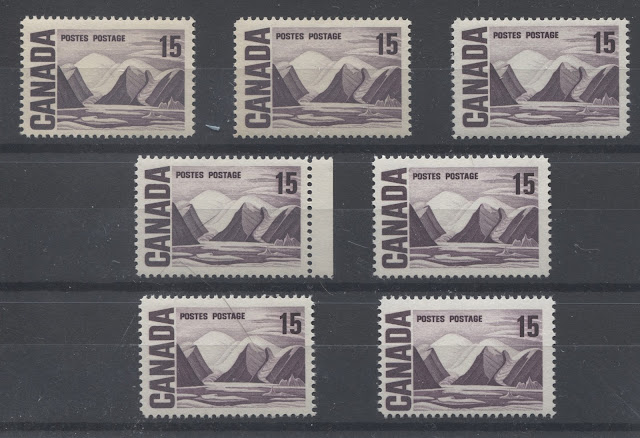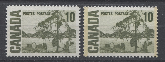 Today's post continues my examination of shades on this issue, and features two of my favourite stamps for the range of colour exhibited: the 10c Jack Pine and 15c Bylot Island stamps. It is almost impossible to exhibit the full range of shades that can be found without doing a detailed study of used examples, but I will attempt to show a representative selection of the shades that can be found on these stamps in this post, and will add other examples as they come to my attention.
