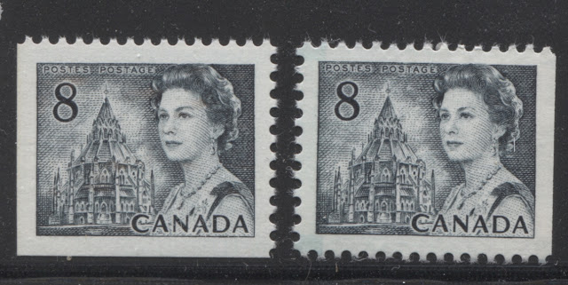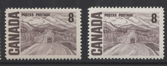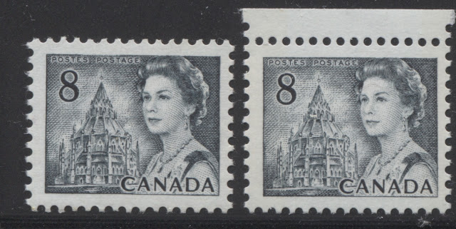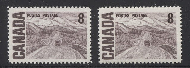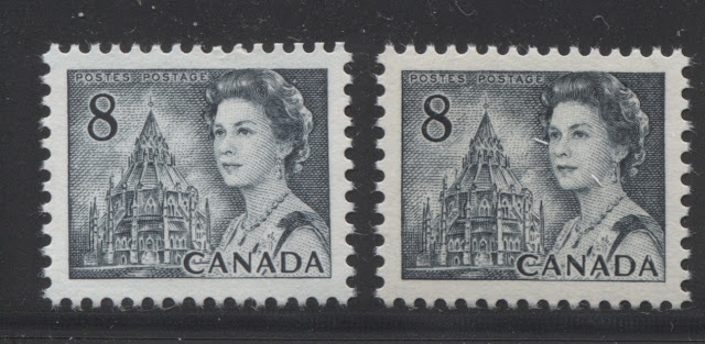 These two stamps are extremely close in shade, and to many collectors would be indistinguishable. However, if you look very closely, you can just see that the right stamp is ever so slightly greenish compared to the left stamp. The left stamp is untagged, and printed on a white, horizontal wove paper, with light vertical ribbing, and with a creamy PVA gum that has a satin sheen. It comes from the 25c booklets that were issued mainly between 1972 and 1974. The stamp on the right is General Ottawa tagged with the migratory OP-4 taggant compound, and is printed on smooth, horizontal wove paper with a cream PVA gum that is thicker and has an almost semi-gloss sheen. It comes from the large $1 booklet that was issued on December 30, 1971.