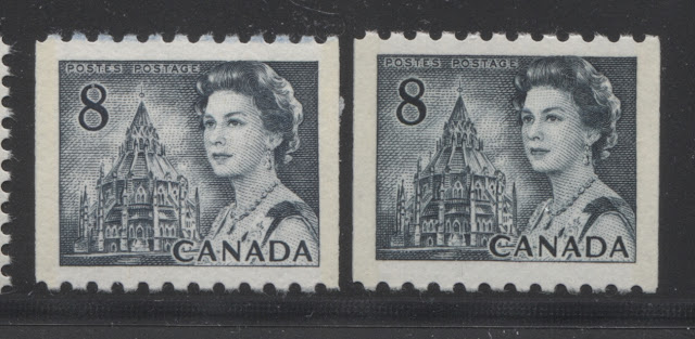 I have found that the coils in general, show much less variation than either the sheet stamps, or the booklet stamps. However, you should be able to see from this scan that the right stamp is definitely greenish compared to the left stamp. Both stamps are General Ottawa Tagged, and both appear to be OP-2. However, the one on the right is printed on a vertical wove paper with matte PVA gum, and the tagging is a pale washed out green. The stamp on the left is printed on a vertical wove paper with slightly shinier eggshell PVA gum, and the tagging is a much deeper and brighter yellow. Under ultraviolet light, the paper of the left stamp is a medium fluorescent, while the paper of the right stamp gives a dull fluorescent greyish reaction.