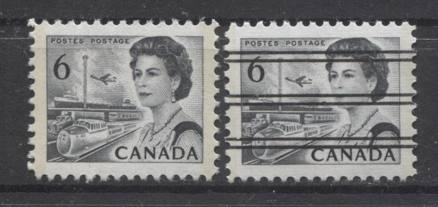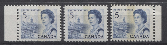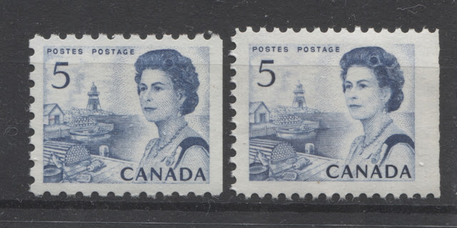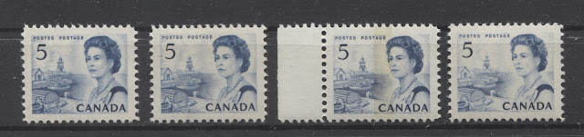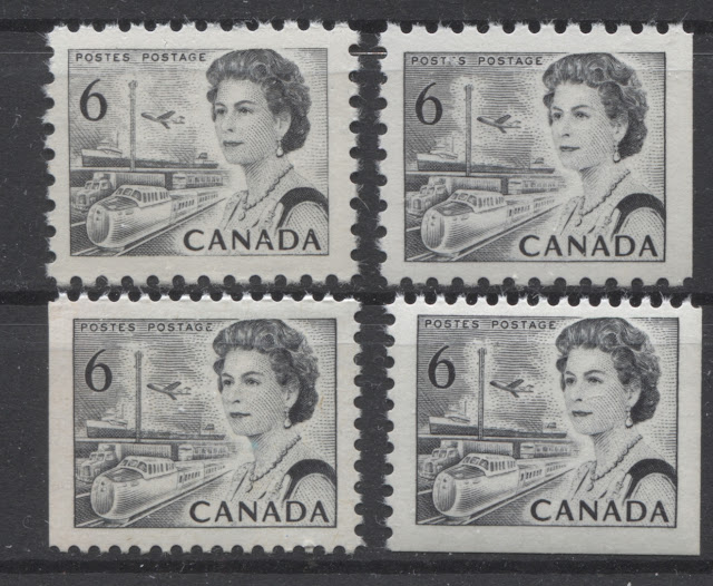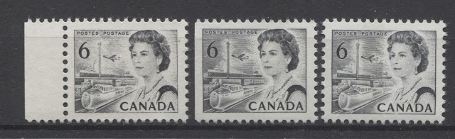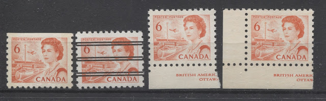 This is one of those stamps that has a surprisingly larger range of shades than one would expect. The coil stamps are a distinctly different orange shade that lacks the red of the shades found on the other stamps. As you will see, the booklet stamps display much the same range of shades as the sheet stamps. All of the 6c orange stamps have dex gum. In comparing shades, I prefer to focus on the Queen's hair, as this is where the differences are most pronounced, I find.