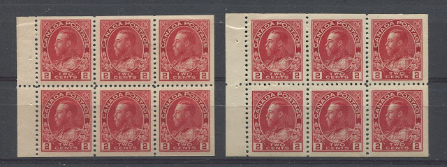 The booklets were issued throughout the life of this stamp, so one would expect the same range of shades. However, this is not the case in practice. The common printings of these were the normal sized wet printings measuring 17.75 mm x 21.5 mm, on vertical wove paper, usually showing some fine or coarse mesh clearly on the back. Unitrade describes this only as carmine. The more expensive booklets were the squat printings measuring 18 mm x 21 mm on vertical wove, or 17.7 mm x 21.5 mm on horizontal wove paper. These were the earlier printings from before 1915, and are generally found in the early shades.