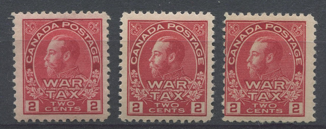 I believe that the dates given in Unitrade for the deep red must be incorrect because the 2c green, which replaced this stamp had already appeared in April 1922. So unless this was an emergency printing to cover a shortage of 2c greens, I think the correct dates are probably 1921-1922. Another notable observation is the discontinuity of dates: there is no group listed for 1916, 1919 and 1921-22. I assume that this is because the main carmine shade is intended as a "catch-all"for any shade not specifically falling into one of the listed sub-groups.