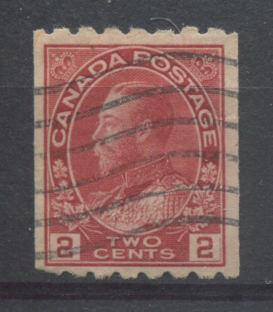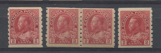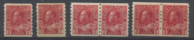 This format again was experimental. It first appeared in 1915 and was all but gone by 1920. Unitrade lists two shades for this issue: carmine and rose carmine. However, the shades of this issue are completely different from the perf. 8 horizontal coils, and yet Unitrade gives them the same shade name.