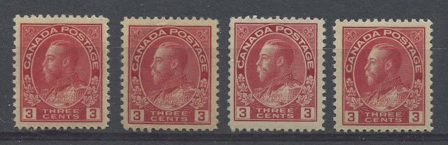 This stamp is perhaps the simplest of the Admiral issues in terms of shades, with Unitrade listing only two shades of the sheet stamps: carmine and rose-carmine, and just carmine for the coil stamps.