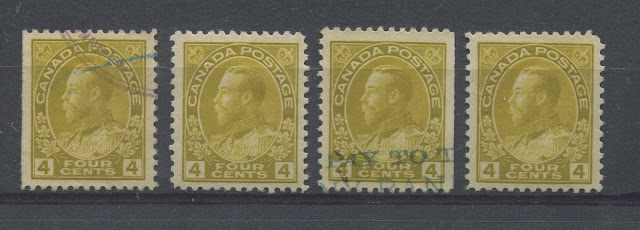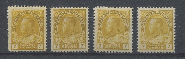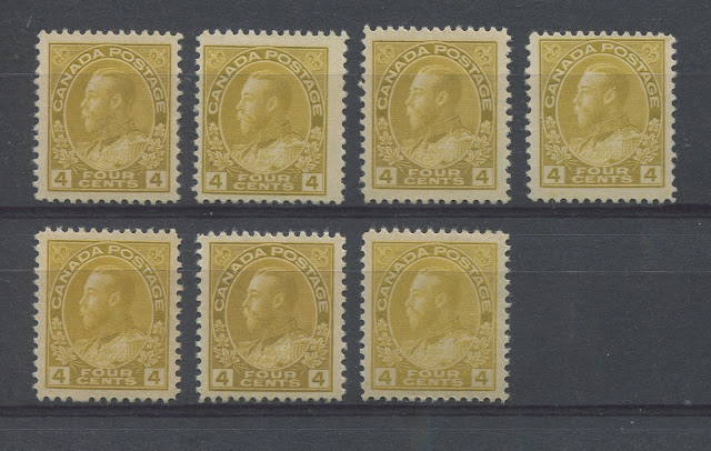 The above stamps are all examples of the greenish yellow as listed in Unitrade. Interestingly, this group is very similar to the olive-bistre group of the 4c wet printings, in that most of the shades are variations of bistre-yellow. We have from left to right as follows: