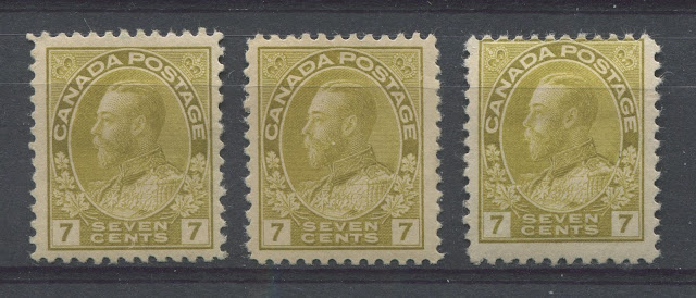 The so called yellow ochre shade is easily the most common, and is usually found with the shiny cream gum normally found on wet printing stamps printed after 1918. It is for this reason, that I believe Unitrade is incorrect about the date being 1912. I have yet to find this shade on a stamp with the 1912 paper and gum. The olive bistre is reasonably close to an accurate description of the shade, though as we shall see, there is a fair bit of variation in it. However, one thing that is clear is that mint examples usually show the yellowish cream gum normally found on printings made between 1915 and 1918. The straw shade can best be described as a very pale brown but the give-away to identifying this shade is the paper and gum: the paper will usually show either coarse or fine vertical mesh and the gum will be a shiny yellowish transparent gum, that is sometimes a bit streaky. These characteristics are common to all first and early printings of the Admiral stamps and once you become familiar with them, they will be unmistakable. The sage green is problematic in the sense that it is not a true sage green. True sage green is quite dark, but nonetheless, it will be identifiable because it is the only shade to appear predominantly greenish. In addition, it has the gum and paper characteristics of the 1914 printings, which are similar to the 1912 printings: shiny yellowish transparent gum and either coarse or fine vertical mesh being readily visible in the paper. Finally, the scarcest shade, the greenish yellow is tricky. It must appear to be very greenish, without appearing to be a variation of bistre or ochre. In other words, it cannot contain any brown. There are some yellowish olive bistre shades that can be mistaken for greenish yellow, but knowing the correct gum can be helpful here. This was one of the last printings, so mint examples generally have the shiny cream gum that is common to the late wet printings made after 1918.
