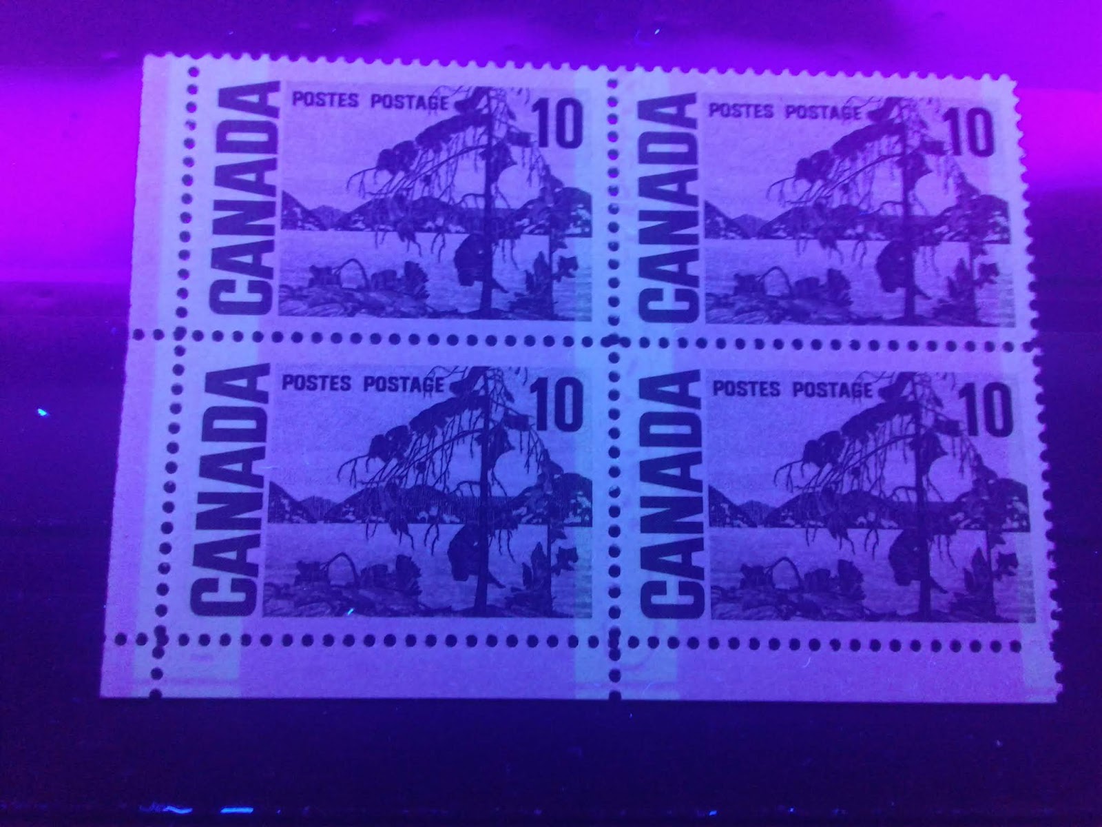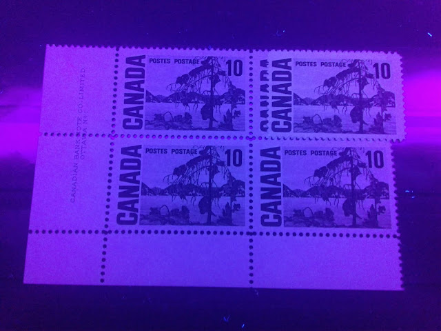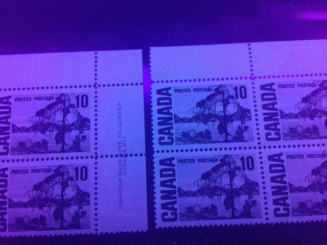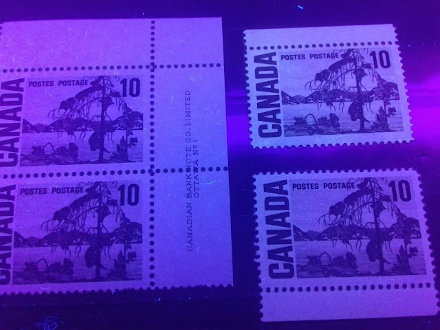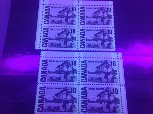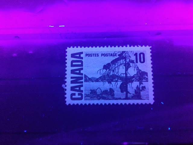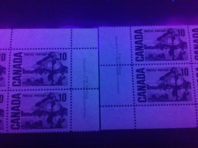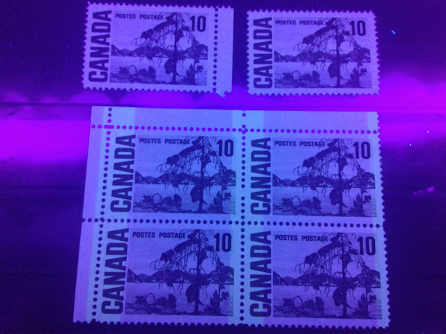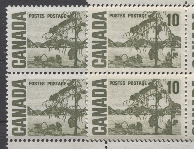 Today's post begins my examination of the second of the high values of this series: the 10c olive green stamp depicting Tom Thompson's "Jack Pine". It has the second highest number of listed varieties in Unitrade behind the 15c Bylot Island. It is the only stamp of the entire series to have appeared with the experimental "spotty white gum" that appeared at the beginning and middle of 1971.