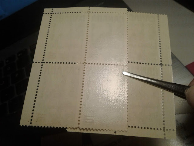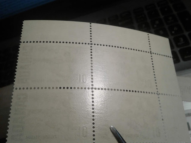 The following pictures show how the spacing is consistent for the outer and inner columns of the sheet. To illustrate this I have taken two upper blocks and lined up the tagging bars of the outer columns, and have also done the same thing for the inner columns: