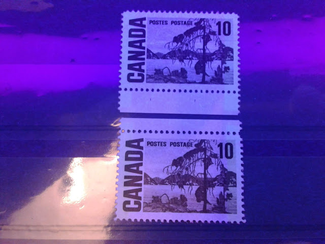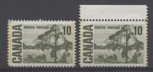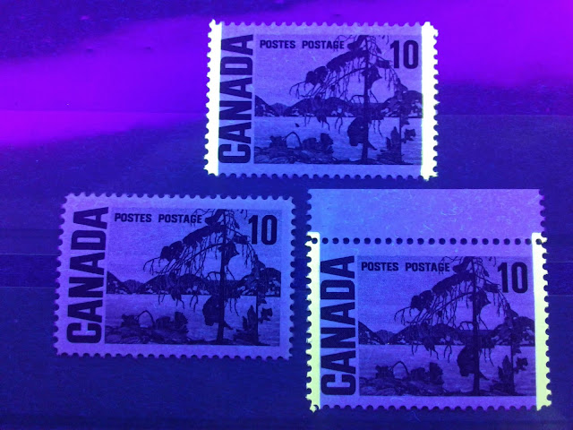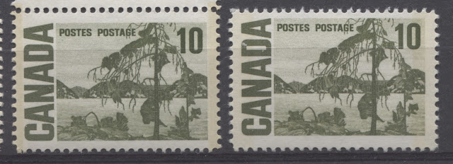 Today's post will be the last to deal with the 10c Jack Pine design from this series. I will examine the last group of printings - those which were made using PVA gum. According to Unitrade, the 10c Forests stamp from the Caricature issue, that replaced this set, was first issued on September 8, 1972. This would suggest that there should have been no more printings of this stamp after that date. Yet, according to Unitrade, the chronology of the printings for this value is really quite interesting indeed: