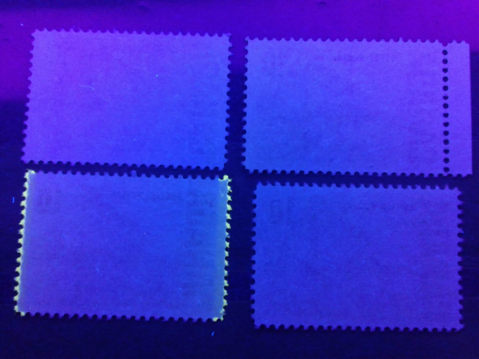 Compare the left hand side of the lower left stamp with the left side of the lower right one. If you do that you can see that the tagging on the two left stamps is a deeper shade of yellow than the two right hand stamps. This difference likely reflects slight differences in the chemical composition of the taggant compound that was applied to the stamps.