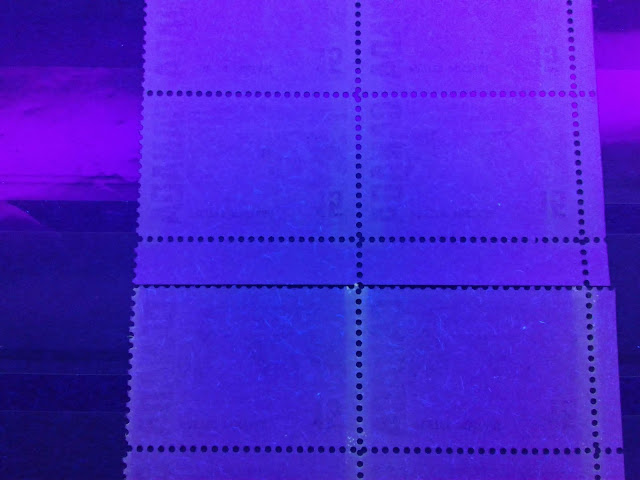 The so called low fluorescent paper is shown on the left block, while the fluorescent paper is shown by the block on the right. The difference is unmistakable. The fluorescent paper, as you can see has a bluish white colour that at first appears to be uniform. Upon close examination with a loupe, one can generally see that this paper is actually a flecked paper in which the florescent fibres are overshadowed by the inherent fluorescence of the paper. In contrast the dull fluorescent papers or low fluorescent papers appear shades of dark blue or violet under the UV light. This paper shouldn't exist tagged, but of course anything is possible with this issue. Once you have seen this difference though, it should be reasonably easy to pick out those on fluorescent paper. Then you can focus on differentiating the different varieties of fluorescent paper and then sorting the dull from low fluorescent paper.