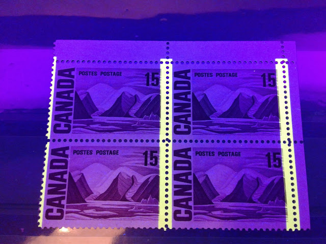 The general Ottawa tagging consisted of 4 mm wide bands applied down the perforations 23 mm apart. The bands appear very light yellow in normal light, and deep bright greenish yellow under UV light as shown in the picture below: