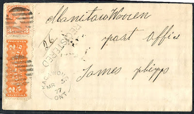 Because registered mail contained important documents, usually of a commercial nature, it is possible to collect some very historically significant covers. The key is to pay attention to the dates, the names of the addressees and the cancellations. The cover below was sent entirely within Manitoulin Island in 1877 and took 2 weeks to travel under 100km!