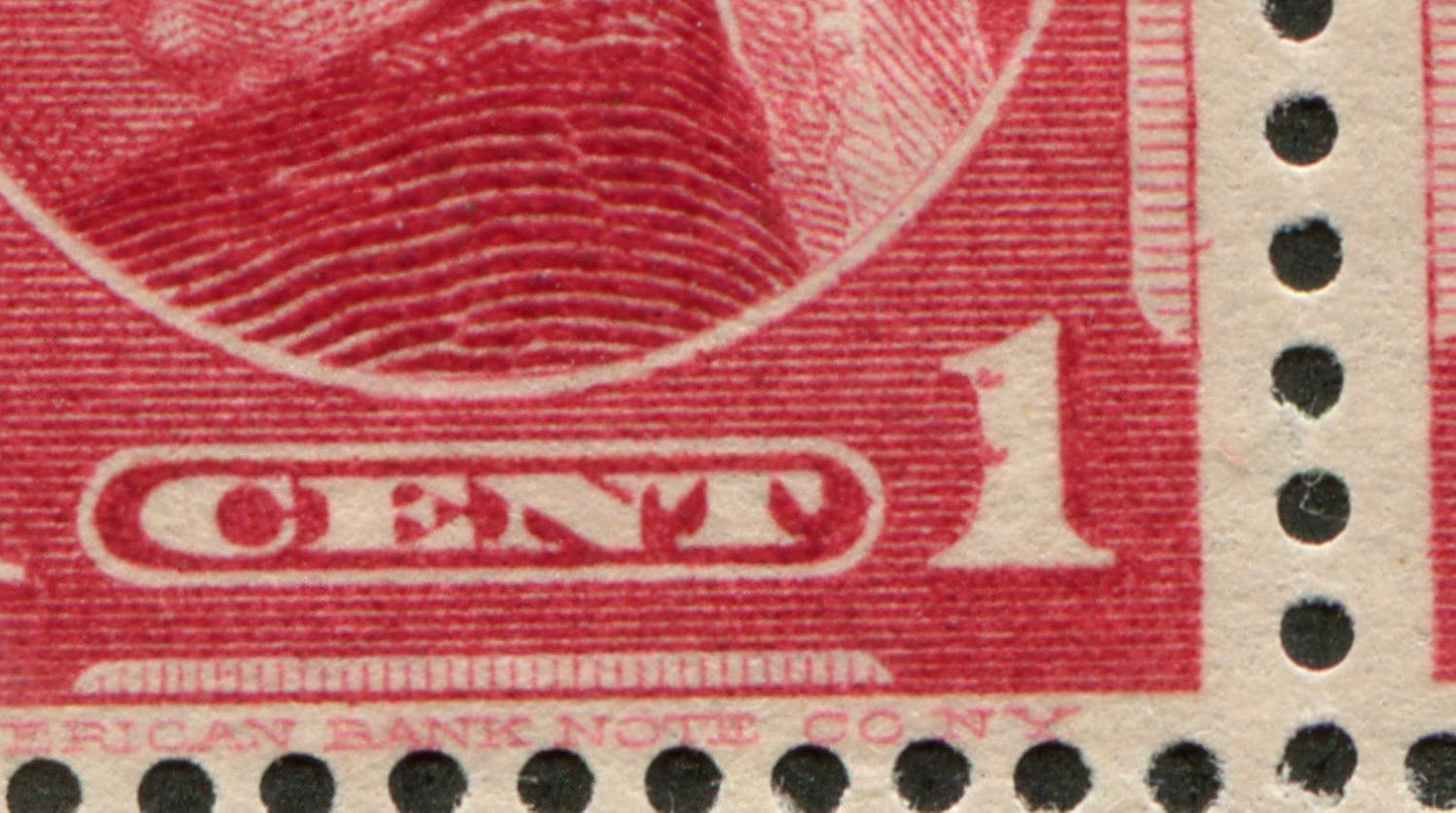 The second is an engraver’s slip. The slip affects the right frameline about half way up the stamp. Interestingly engraver’s slips are well known on the 6c Maple Leaf Issue of Canada and more recently on the 20c Numeral. Both stamps were printed by the ABN as well during the same period. So it is quite possible that there could be others on the other values. In any event, these types of varieties are usually rare, being limited to just one subject on the plate, and usually they are found and corrected.