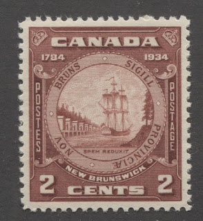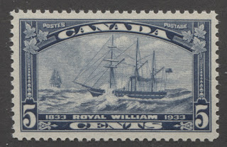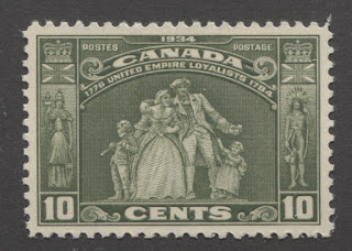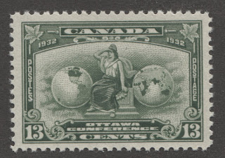 Today's post comes a few days later than scheduled, and will be my last post until October 10. However it deals with a very fruitful and neglected group of stamps: the commemorative issues of 1932-34. This group of stamps were all printed by the British American Bank Note Company using the flat plate method of printing, except for the 3c Ottawa Conference, which was printed using rotary presses. The print quantities were relatively small compared to both the definitive issues at the time as well as later commemorative issues. There are very few collectible shade varieties. However, there are some good paper and gum varieties, imperforates, proof material, plate flaws, plate blocks, first day covers, postal history and of course, because of their size, lots of opportunity to collect cancellations. Centering tends to be poor for these issues, so finding very well centered stamps is a worthy challenge, particularly for the plate blocks. The perforations tended to be 11, which is a very coarse gauge, so stamps with full and even perforations on all four sides are quite difficult to find, especially if they are very well centered and never hinged.