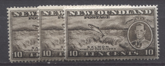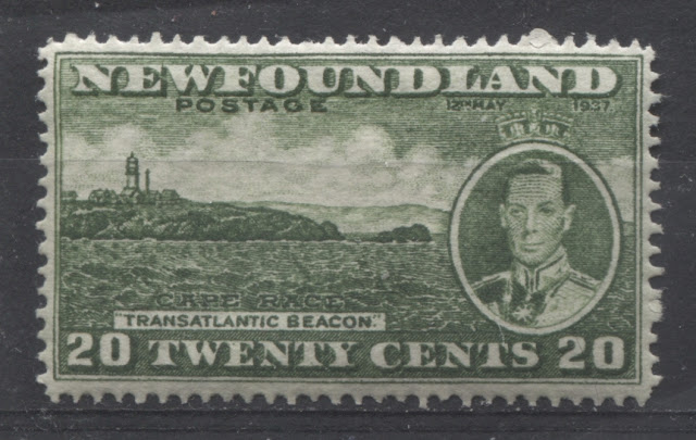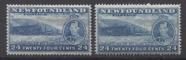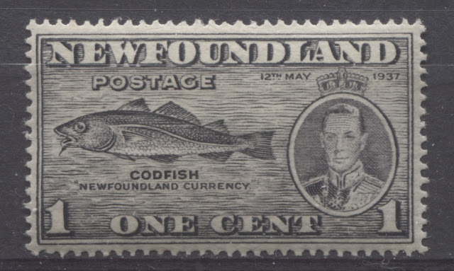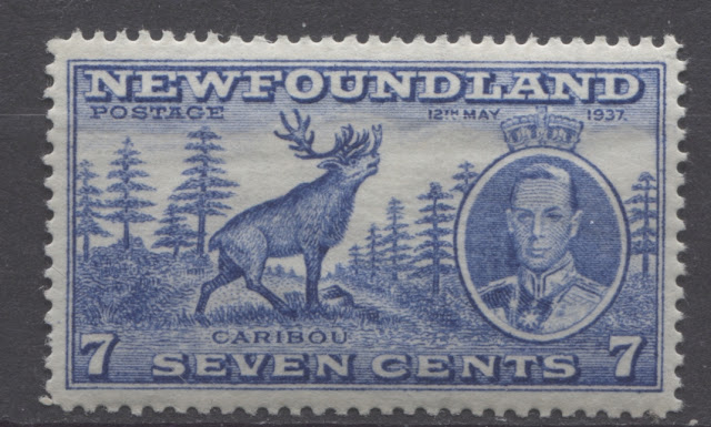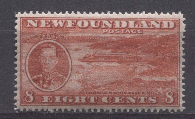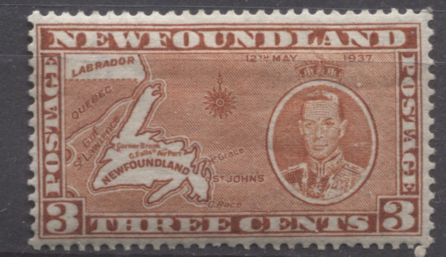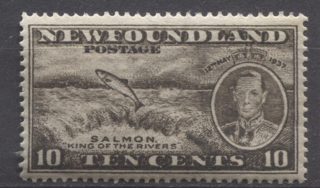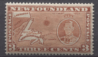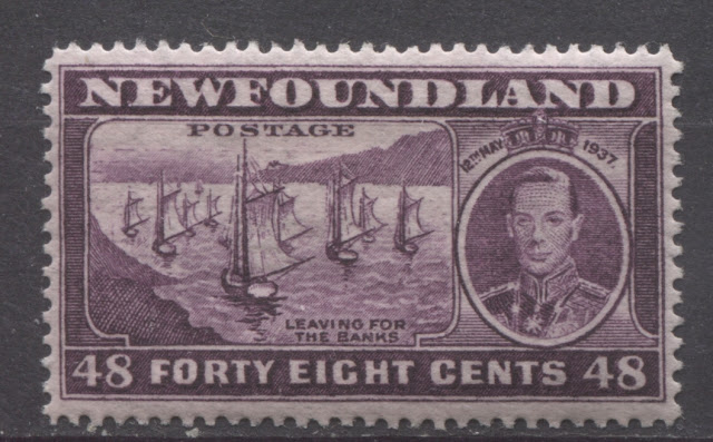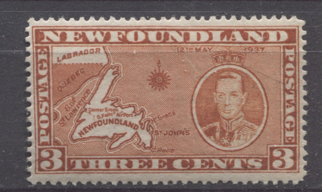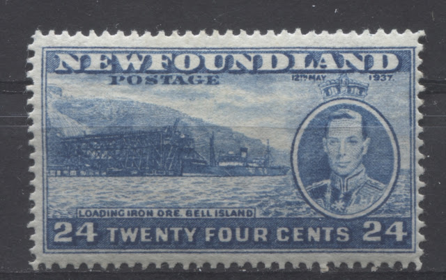 Today's post will explore a set that is completely unique to all of British Commonwealth philately: a commemorative issue, whose size and whose designs are almost entirely based on those of a contemporary definitive issue. Newfoundland issued the 1937 Omnibus Coronation designs, just like every other crown colony in the Empire. But then it was decided that in addition to these, another commemorative set was to be issued, which would feature the designs of the current Resources definitive issue. The result was what collectors today know as the Long Coronation Issue. It consisted of eleven stamps ranging from the 1c to 48c, similar to the Resources definitive issue. In addition, with only three exceptions, being the 1c, 3c and 7c, the remaining 8 denominations were almost exactly the same as the corresponding definitives, with a portrait of King George VI added at the right (or left in the case of the 8c) and an inscription with the date of the Coronation added at the top.