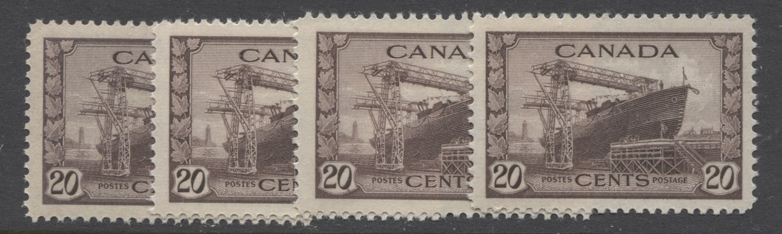 This colour is referred to by Unitrade as chocolate, but it is far too dark to be thus. It is more of an violet brown. It varies both in intensity, and tone. In the above scan, the stamps at left and right contain more purple in the mix than brown, while the two middle stamps contain less brown.