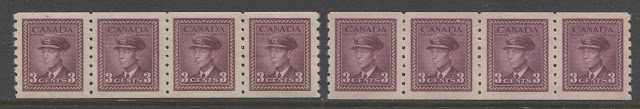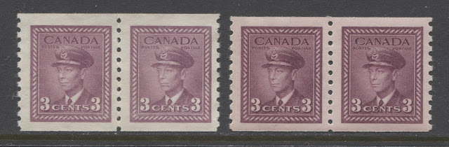 This is the only issue of Canada to have coil stamps in two different perforations: 8.5 and 9.5 vertically. The original issue that appeared between 1942 and 1943, was perforated 8.5, and was generally printed on softer paper. Later in 1948, the coils were reprinted on a thicker, stiffer paper and were perforated 9.5 instead of the 8.5. The difference is marked enough that with experience, you will be able to distinguish them from one another without having to measure the perforations. The scan above shows the two different perforations, with 8.5 on the left, and 9.5 on the right. As you can see, this difference of one hole, makes a large difference to the appearance of the stamps. In general, the perf. 8.5 coils tend to have holes that are often not fully punched, and are widely spaced, giving perforations that are much wider, and consequently much harder to find with fully intact and even perforations. The later perf. 9.5 coils have holes that are punched much more cleanly, and are spaced closer together.