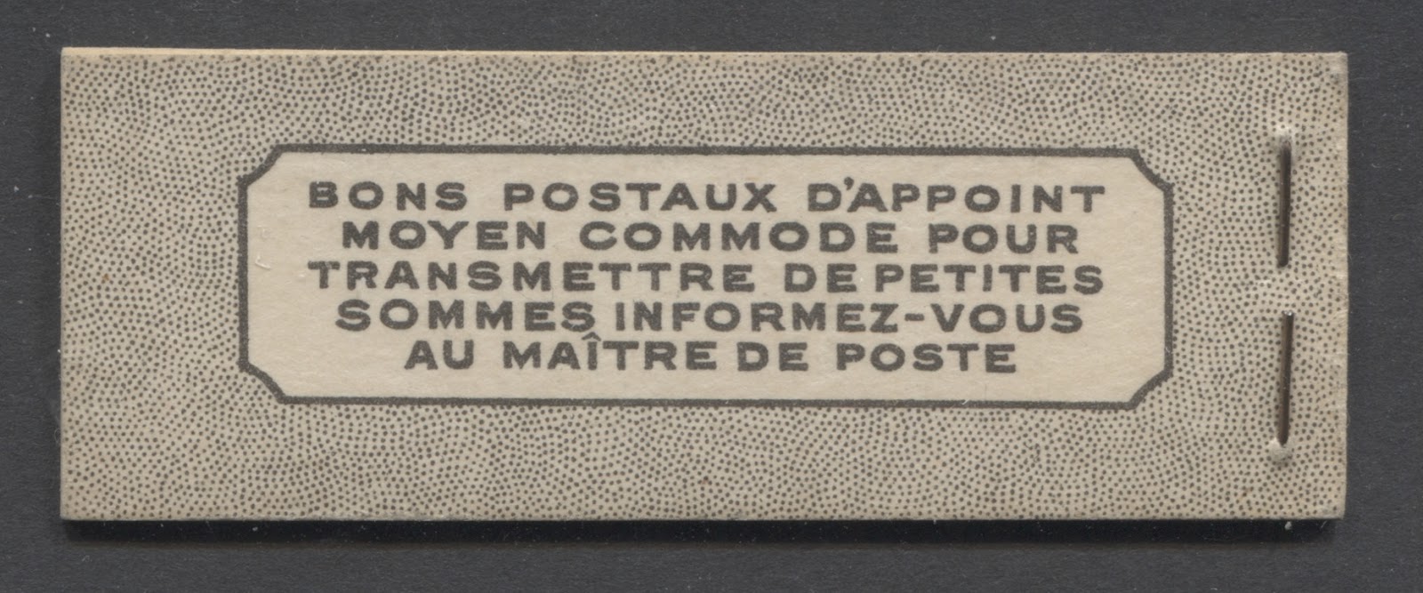 This is the French version of the type A back cover, which Harris refers to as type B. Again, there is only one die type for this cover. It is found on the following booklets: