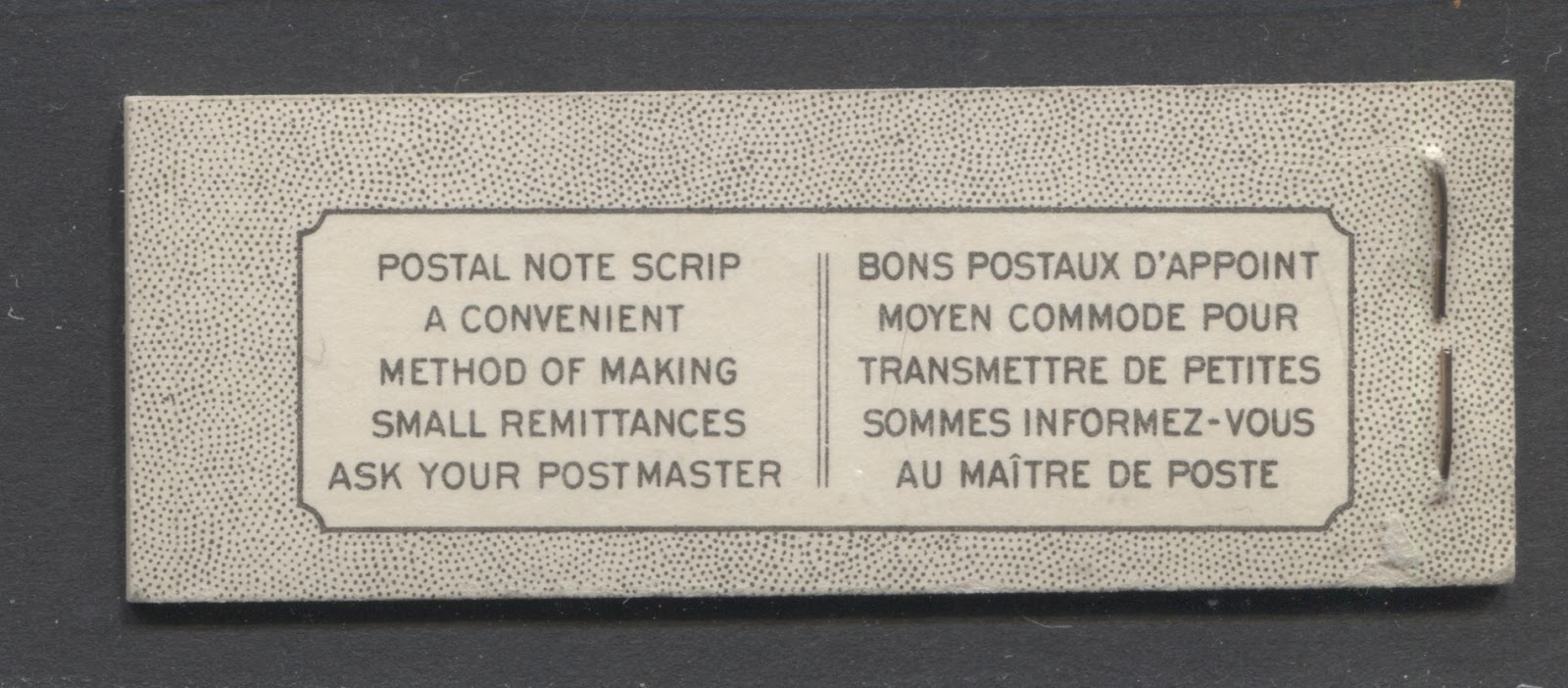 This is the back cover of the bilingual chewing gum booklet, which Harris refers to as type K. Like the Type C cover, that had the two sub-types, depending on whether "post master" was one word or two separate words, this one also exists in two sub-types as well. In addition to these two sub types, Harris has identified up to 15 different dies for each type, and these are distinguished by looking at the dot pattern to the left of the upper left corner of the text panel. This makes for a staggering 450 possible booklets for this format! However, nowhere near this many have, as yet been reported. The difference between these different dies is too difficult to describe here, so you will have to simply compare and contrast the booklets that you have, or refer to a copy of Harris's book that contains the full pictorial chart.