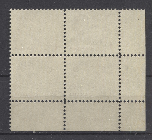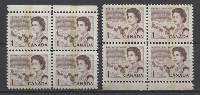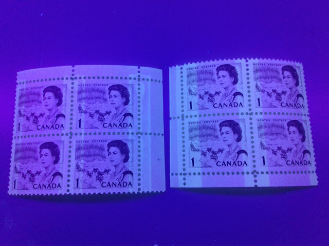 Unitrade lists the paper of these stamps as hibrite. While it is certainly true that it appears hibrite when compared to the dull and low fluorescent papers, it is not the absolute brightest on the scale, and consequently, I would tend to classify is as more of a high fluorescent than a hibrite paper. In ordinary light, it still has a fairly creamy, off-white appearance, though less so than the original dull papers. The picture below shows an example of the untagged block and a single tagged with the Winnipeg centre bar: